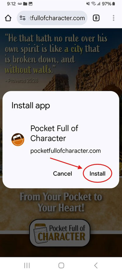 4. Tap "Install" to install Pocket Full of Character as a web app.
