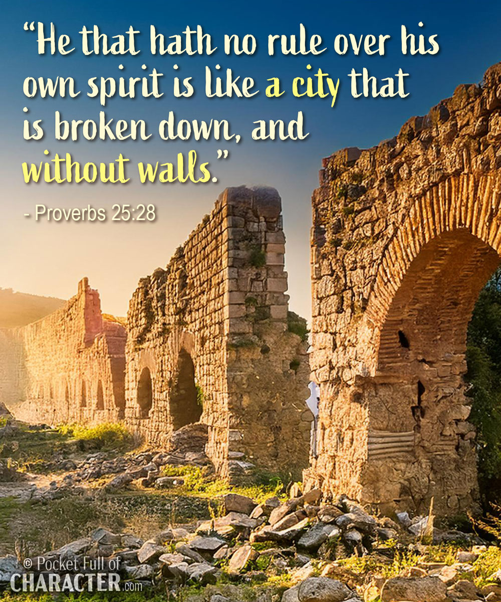“He that hath no rule over his own spirit is like a city that is broken down, and without walls.”Proverbs 25:28